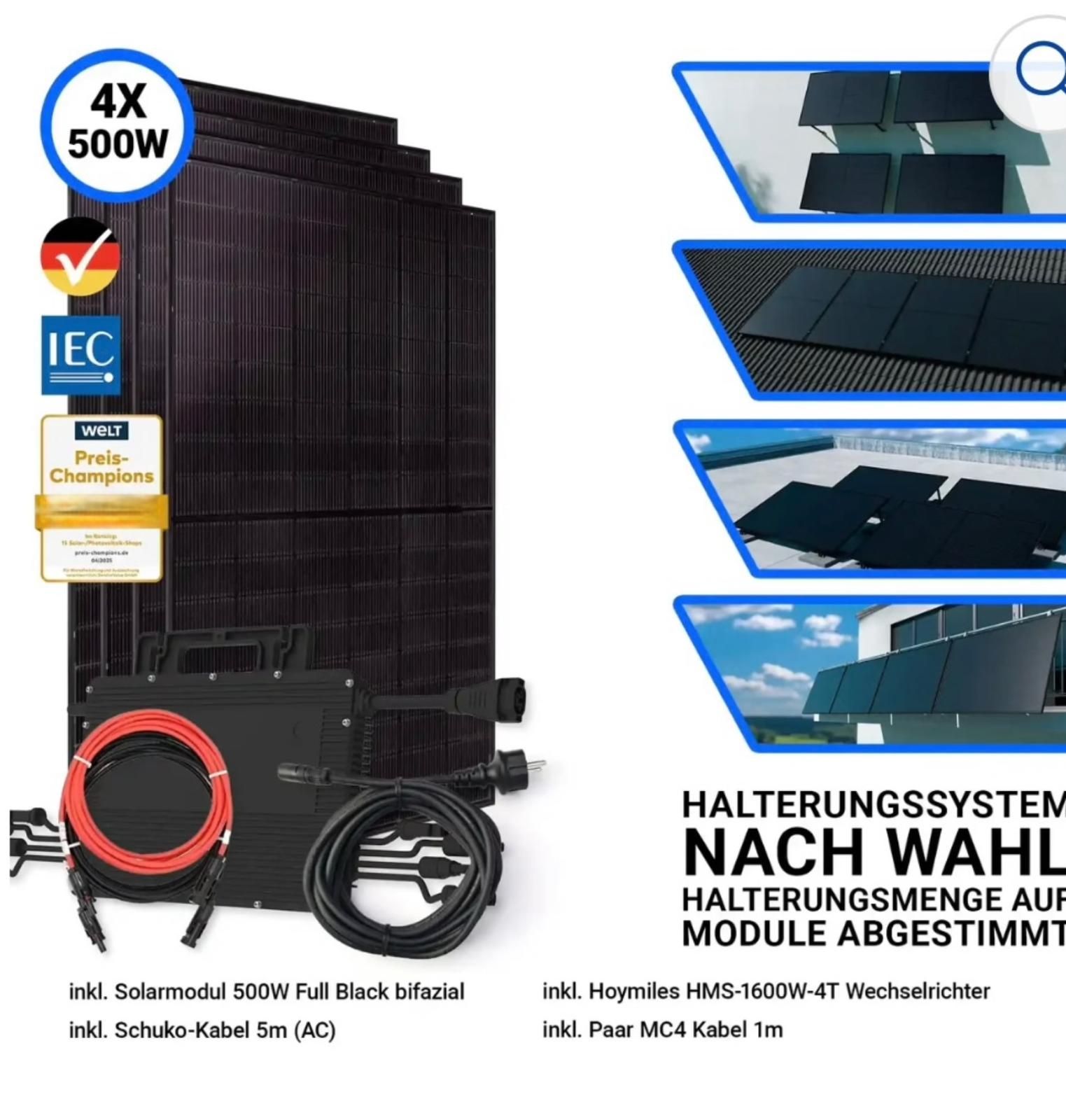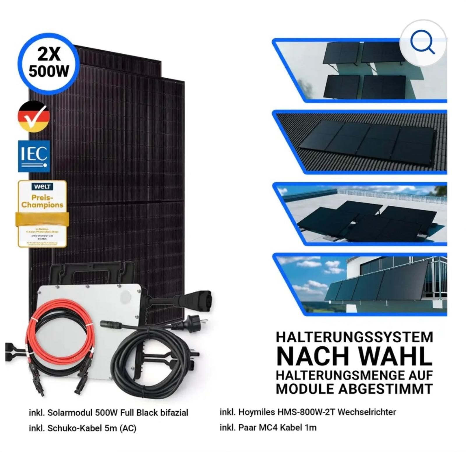 2x Jolywood 500W Full Black bifazial & Hoymiles HMS-800W-2T Wechselrichter.